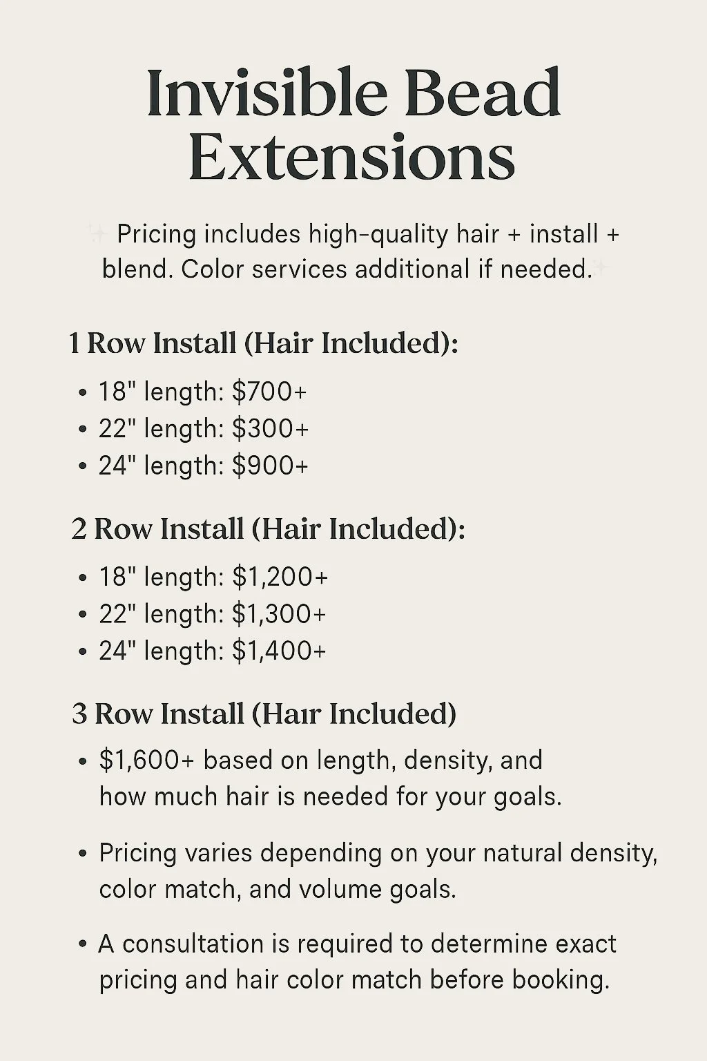 GENERALLY WHEN BOOKING AN INSTALL YOU MAY BE ASKED FOR A DEPOSIT OF $500 TO PURCHASE YOUR NEW HAIR AND SECURE YOUR SPOT. PLEASE NOTE THAT THIS IS A NON-REFUNDABLE DEPOSIT.